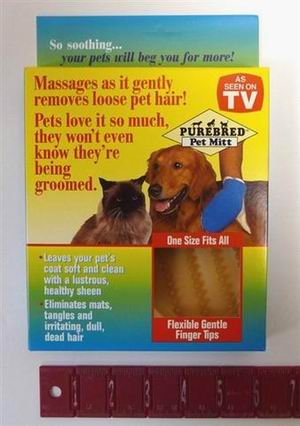 This As seen on TV Pet Mitt massages as it gently removes loose pet hair. Leave's your pet's coat soft and clean with a lustrous, healthy sheen. Eliminates mats, tangles and irritating, dull, dead hair. Suitable for short and long hair pets. Flexible gentle finger tips pamper your pet as they lift out dirt, dust and irritating, dull, dead hair. Great for grooming around legs, tail and hard to reach places. Cleans up pet hair from furniture, fabric and carpets.